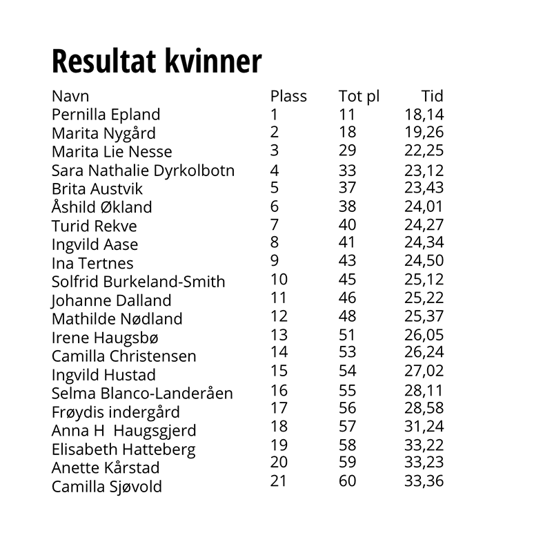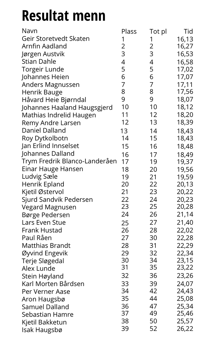 Vinnar i dameklassen vart Pernilla Epland med tida 18:14. Dette er stor forbetring frå eiga vinnartid frå i fjor på 20:31. I herreklassen vann Geir Storetvedt Skaten med tida 16:13. Vinnartida til Jørgen Austvik frå i fjor på 17:03 vart dermed slått med 50 sekund!